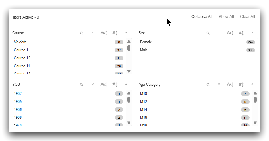 The filter panels display a summary count of the various values held in the table columns. Click a row to highlight it and the underlying table will be filtered to that selection. Ctrl-click to add more filters. - Text search. Type in your search value and the rows that contain your text will be displayed.